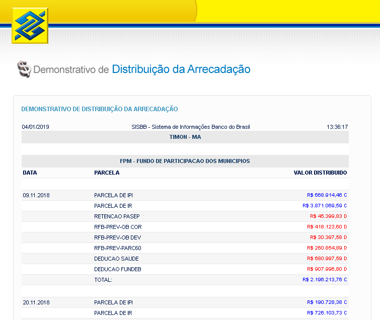 A soma fica mais alta quando se trata do Fundo de Participação do Município, que destinou R$ 21.030.984,82 milhões à cidade timonense.
