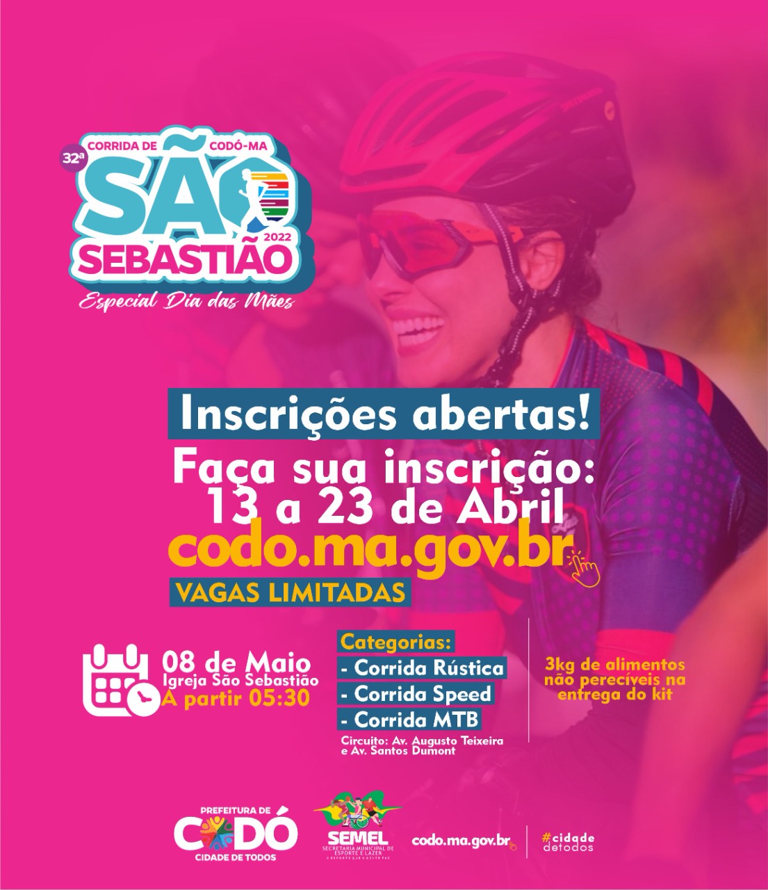 Após novo decreto, a Prefeitura de Codó por meio da Secretaria Municipal de Esportes (SEMEL) vai realizar a 32ª Corrida de São Sebastião no dia 8 de maio, dia das mães. Os participantes podem efetuar suas inscrições que estão abertas através do site codo.ma.gov.br/corridadesaosebastiao/ até o dia 23 de abril nas seguintes modalidades.