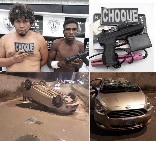 Os outros dois suspeitos que praticavam assaltos foram avistados, ainda à noite, pela polícia. Houve perseguição, troca de tiros, e, durante determinada manobra, a dupla acabou sofrendo um acidente, e o carro capotou. Eles tentaram fugir, mas foram presos. As informações são do comando da 3ª Companhia do 8º BPM.