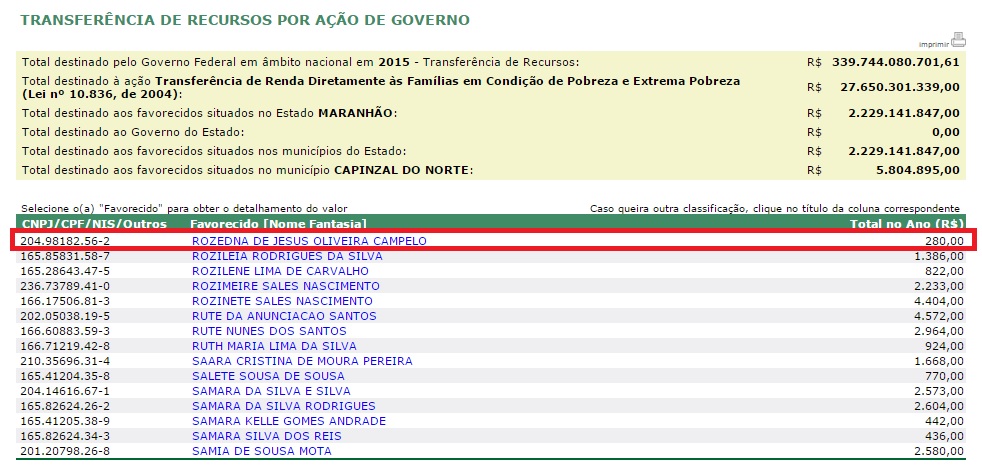 O valor recebido em 2015, que foi de R$ 280,00, de acordo com o Portal da Transparência é relativamente pequeno, mas isso indica que esposa do Prefeito, Roberval Campelo, foi beneficiada, o que é totalmente ilegal, uma vez que não pertence a uma família de baixa renda.