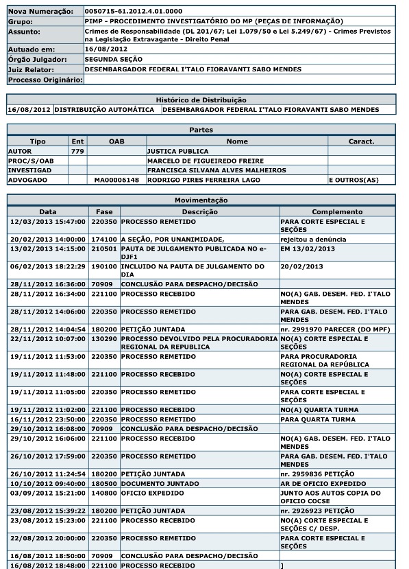De imediato a Corte recusou a denúncia, mas segundo o MPF, o inquérito policial que a indiciou foi encaminhado à Procuradoria Regional da República da 1ª Região, responsável por casos voltados a prefeitos e não ex- prefeitos.