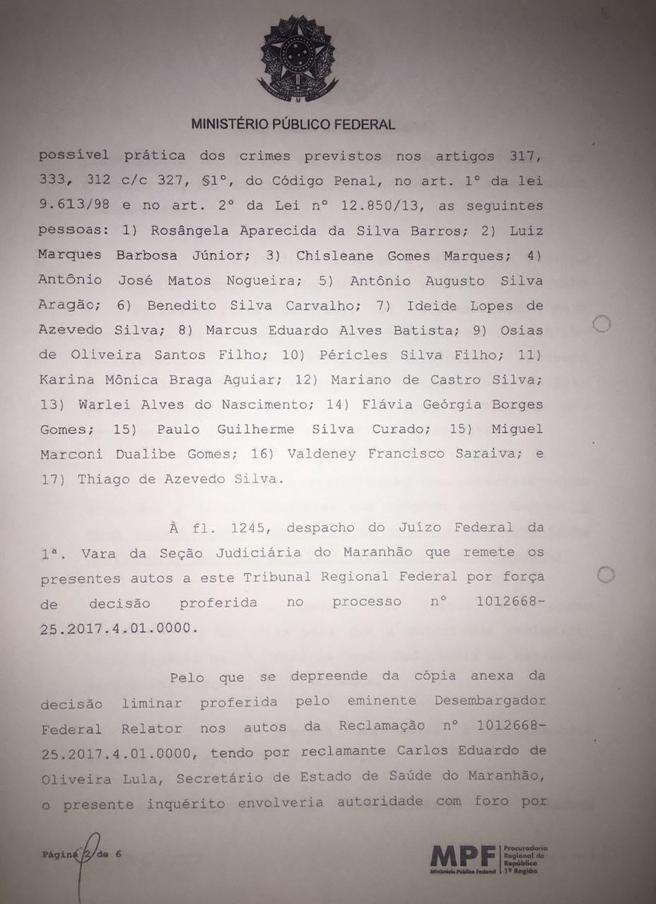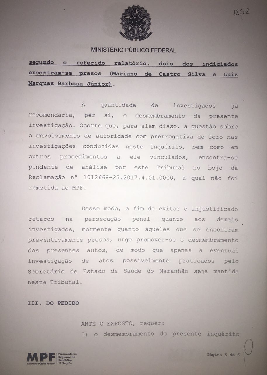 No mesmo parecer, ele pede que o desmembramento seja realizado em fase do foro de prerrogativa do secretário de Saúde, Carlos Lula. “Urge promover-se o desmembramento dos presentes autos, de modo que apenas a eventual investigação de atos possivelmente praticados pelo secretário de Estado de Saúde do Maranhão seja mantida neste Tribunal”