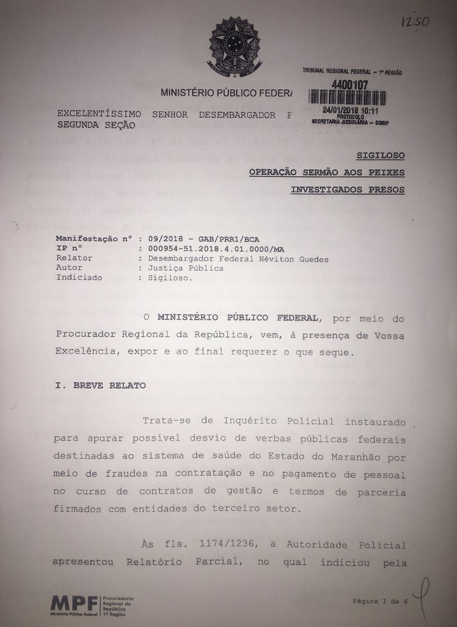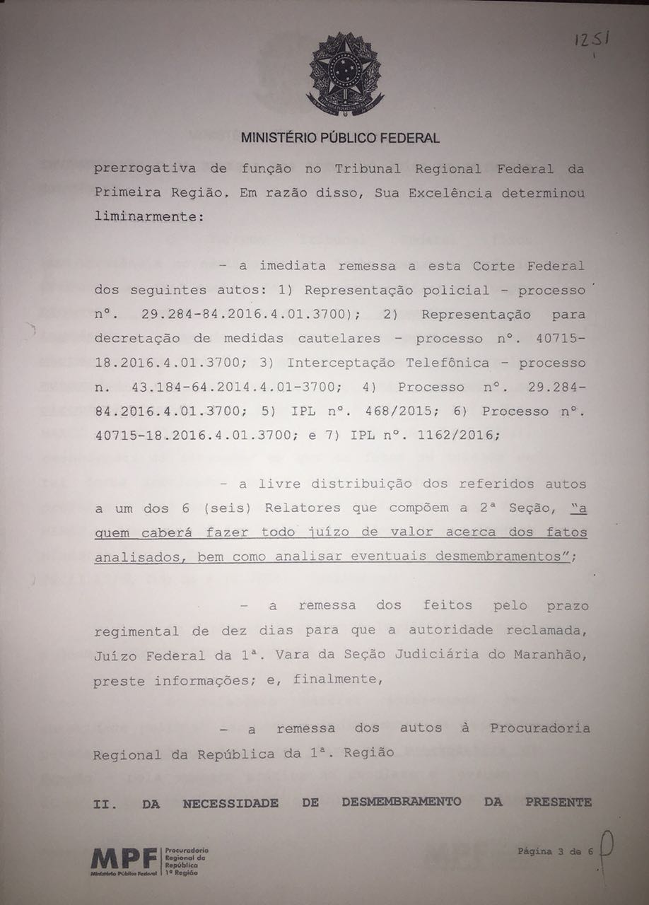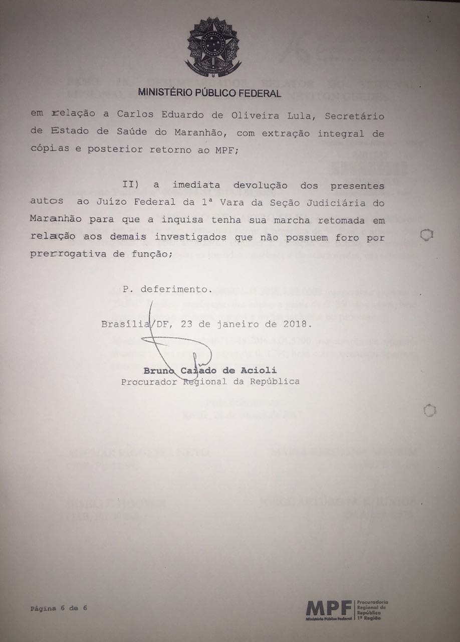 De acordo com o parecer obtido pelo Blog do Neto Ferreira, Caiado pede que seja remetido ao autos dos investigadores sem foro de prerrogativa para a primeira instancia da Justiça Federal. “A imediata devolução dos presentes autos ao juízo Federal da 1 Vara da Seção Judiciaria do Maranhão para que a inquisa tenha sua marcha retomado em relação aos demais investigados que não possuem foro por prerrogativa de função“.