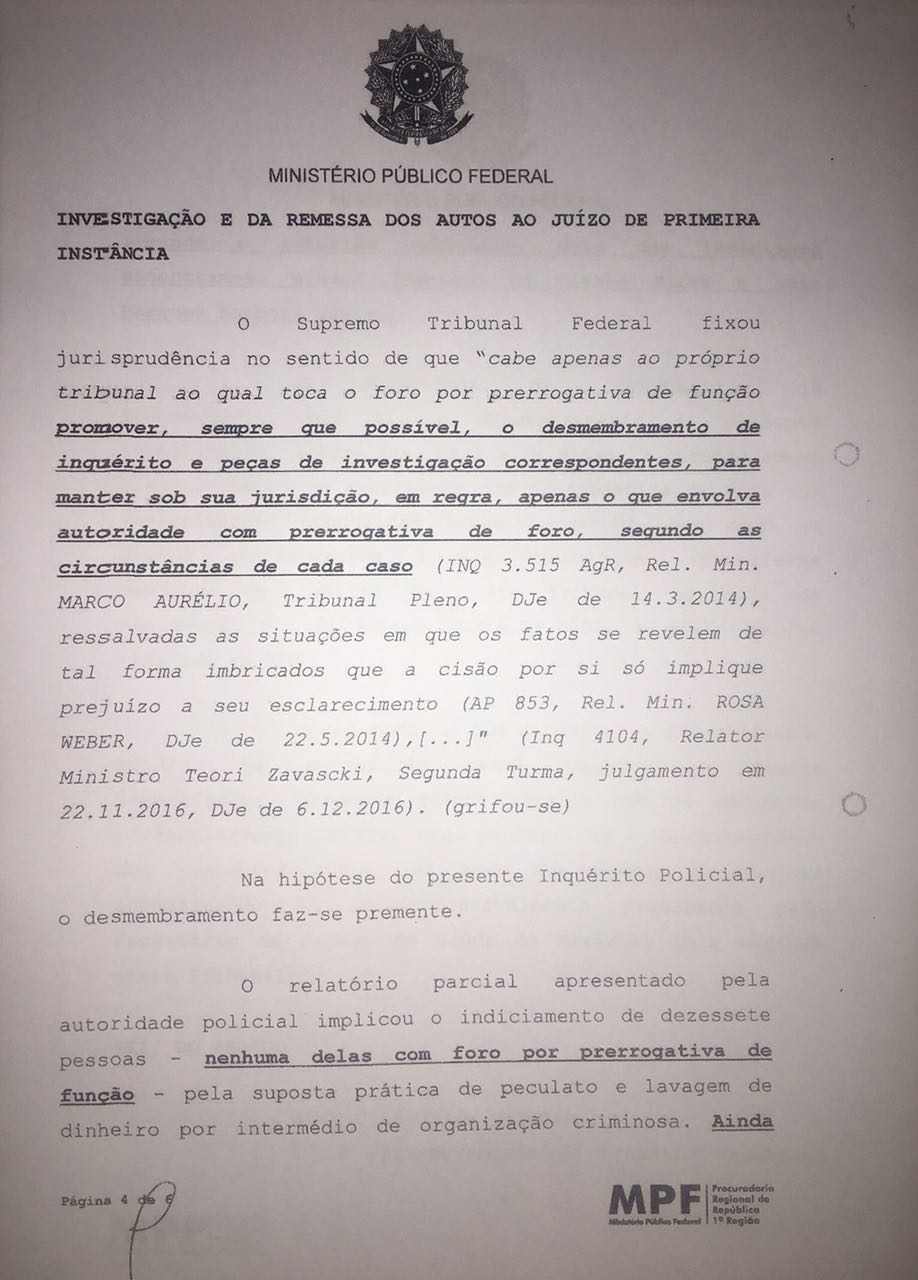 O procurador Regional da República, Bruno Caiado de Acioli, enviou manifestação ao Tribunal Regional Federal da Primeira Região – no Inquérito