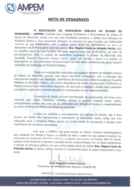 “Cumprimentando-o, sirvo-me do presente para em nome do Ministério Público, agradecer a defesa desta instituição ministerial efetivada por vossa excelência durante a sessão do dia 26.05.2014 na Assembleia Legislativa, em virtude de pronunciamento do deputado Raimundo Cutrim tentando desqualificar a atuação do Ministério Público do estado, através da procuradora-geral de Justiça, principalmente em virtude de ação penal que é movida contra o mencionado parlamentar”, diz trecho de nota.