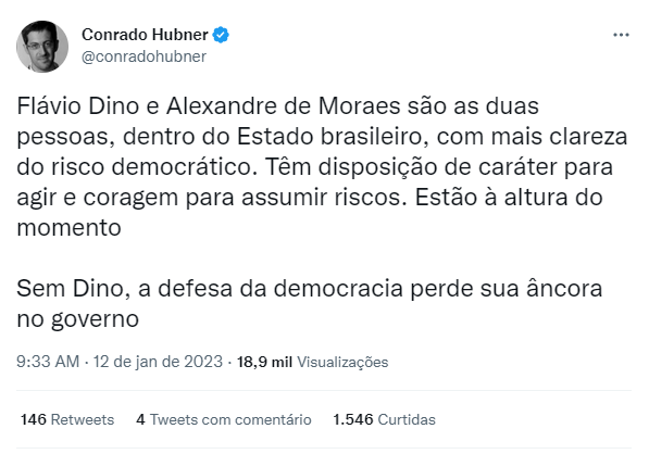 Nas redes sociais, o professor da Universidade de São Paulo, Conrado Hubner, elogiou a atuação do ministro do Supremo Tribunal Federal (STF), Alexandre de Moraes, e do ministro de Justiça e Segurança Pública, Flávio Dino (PSB), no combate aos atos golpistas que ocorreram no domingo (8), em Brasília.