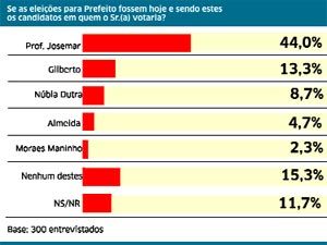 Segundo os dados, colhidos entre os dias 22 e 24 de agosto, Professor Josemar tem 44% das intenções de voto e seria o novo prefeito da cidade se as eleições fossem hoje. O ex-prefeito Gilberto Aroso (PMDB) está 13,3%, à frente de outros três concorrentes, mesmo após a impugnação do seu registro de candidatura e a indefinição sobre a participação no pleito.