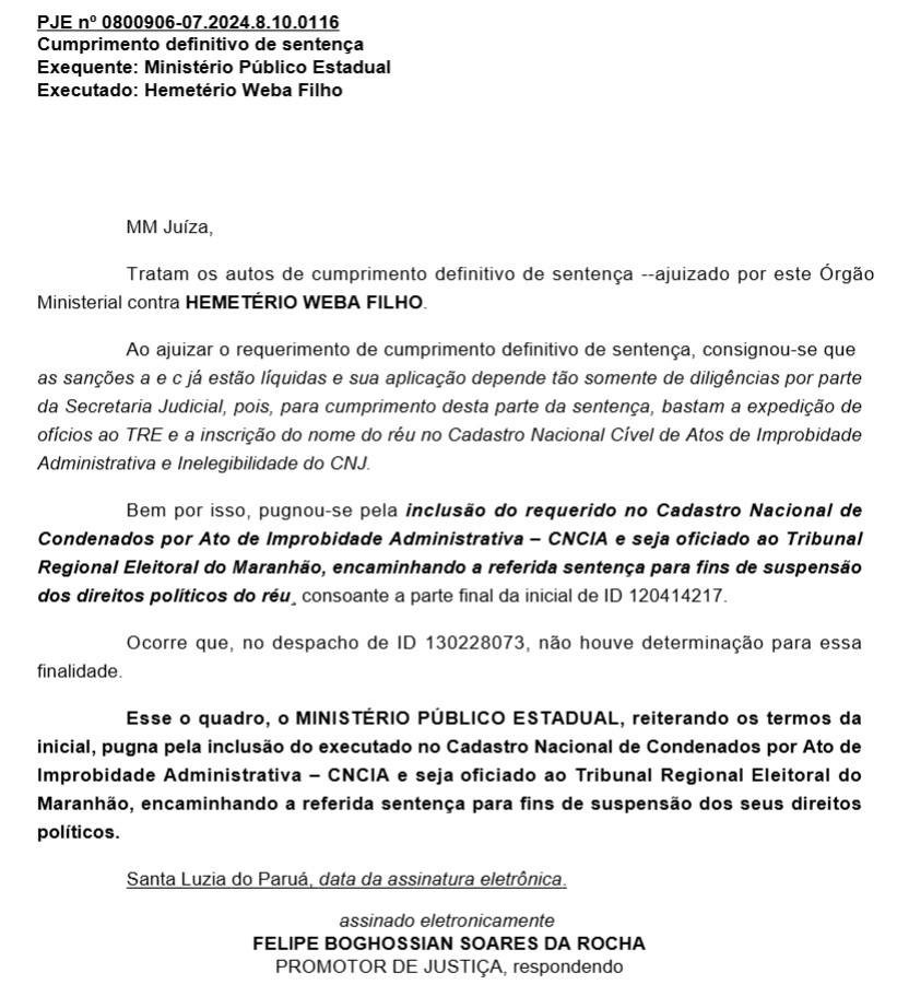 Na ação, assinada no último dia 30 de outubro, o promotor solicita que a juíza intime Weba para o pagamento imediato da multa sob pena de penhora de seus bens, além de sua inclusão no Cadastro Nacional de Condenados por Ato de Improbidade Administrativa e a comunicação ao Tribunal Regional Eleitoral do Maranhão para a efetivação da suspensão de seus direitos políticos.