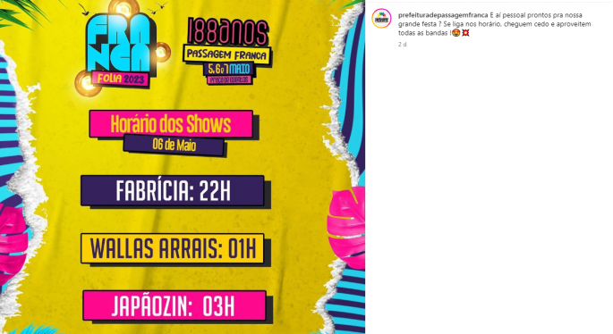 Em Ação Civil Pública ajuizada, o Ministério Público do Maranhão (MPMA) requereu, liminarmente, que o prefeito de Passagem Franca, Marlon Torres, cancele imediatamente a realização do evento “Franca Folia”, previsto para os dias 5 a 7 de maio, para comemorar o aniversário de 188 anos do município. O evento teria shows dos artistas Fabrícia, Wallas Arrais e Japãozin. Mesmo instada, a Prefeitura não informou os valores que seriam gastos no evento.