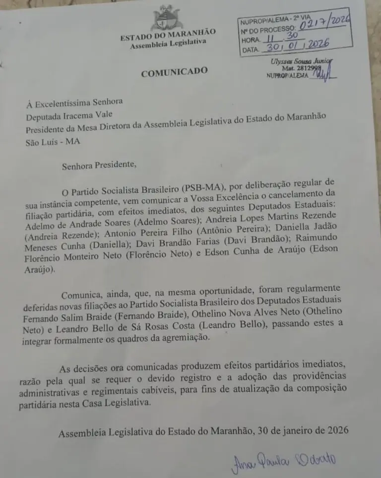 Nesta sexta-feira (30), o Partido Socialista Brasileiro (PSB) no Maranhão comunicou a presidente da Assembleia Legislativa do Maranhão (Alema), Iracema Vale, sobre o cancelamento da filiação partidária de sete parlamentares.