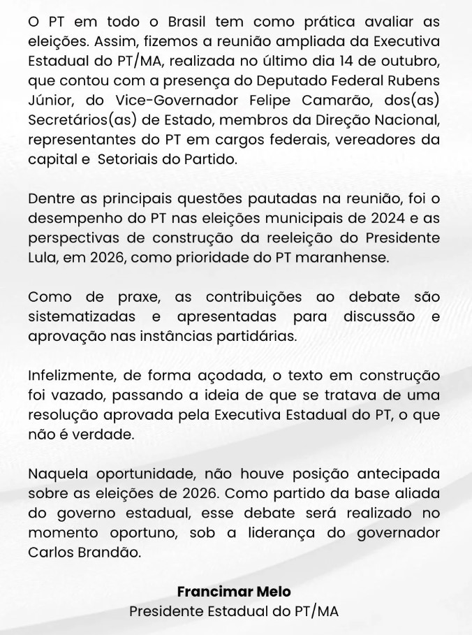 Em nota, o presidente petista Francimar Melo, confirmou que existiu a reunião e que os assuntos foram tratados, porém disse que de “forma açodada, vazaram o texto inicial, passando a ideia de que se tratava de uma resolução da Executiva Estadual do PT, o que não é verdade”.