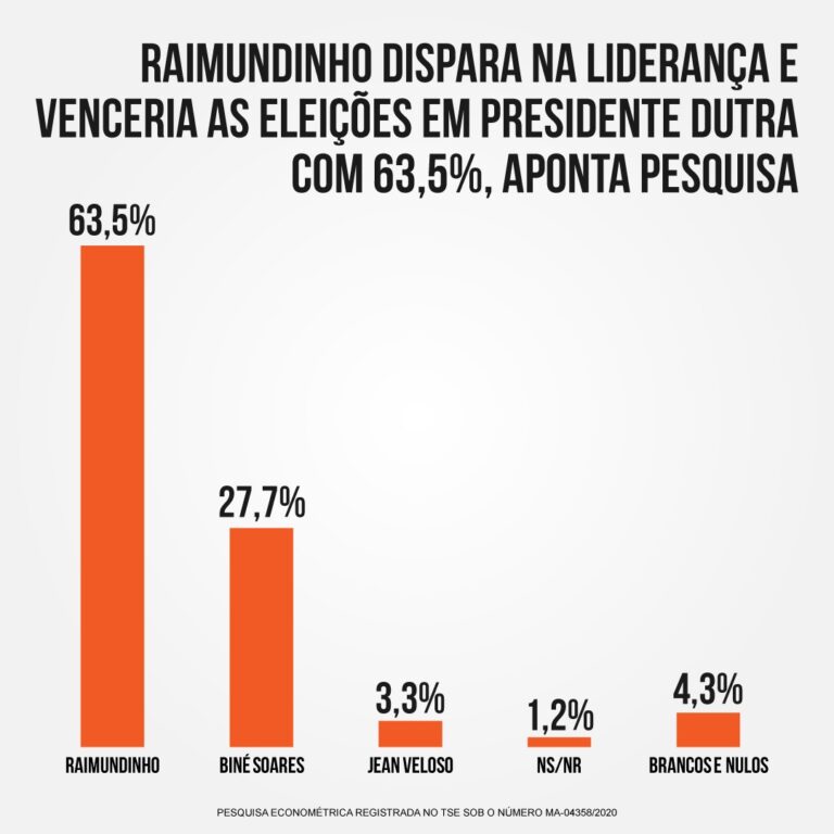 Se as eleições 2020 fossem hoje, o empresário Raimundinho da Audiolar (Republicanos) seria eleito o novo prefeito de Presidente Dutra com uma ampla vantagem em relação ao segundo colocado. Isso é o que aponta pesquisa do Instituto Econométrica/Itaqui-Bacanga divulgada neste sábado, 3.