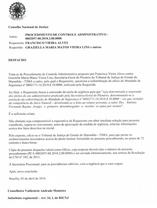 O conselheiro do Conselho Nacional da Justiça (CNJ), Valdetário Andrade Monteiro, determinou que o presidente do Tribunal de Justiça do Maranhão, desembargador Joaquim Joaquim Figueiredo, esclareça a respeito de uma redistribuição suspeita feita pela secretária-geral do Plenário do TJ.