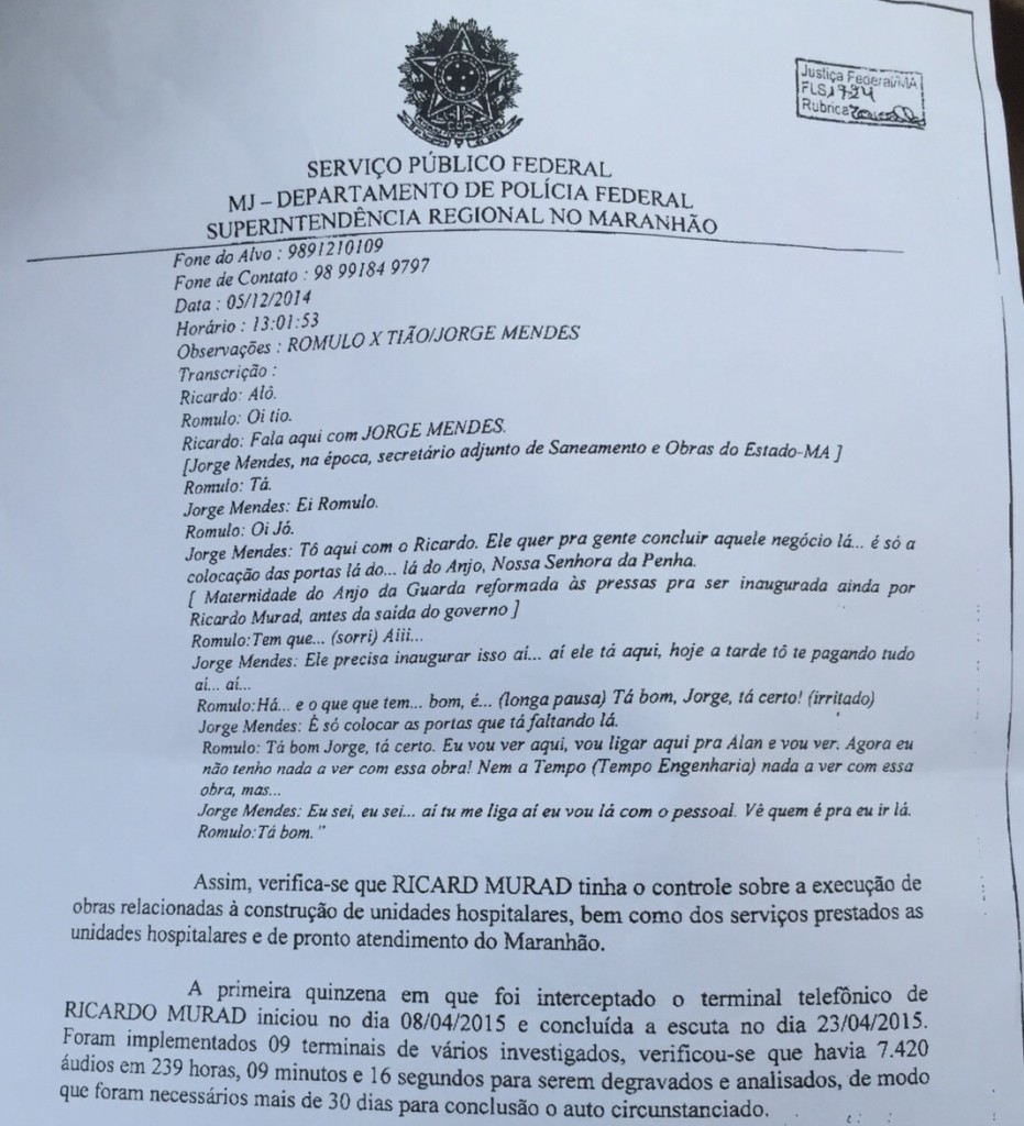 Em uma das ligações telefônicas gravadas, Trovão conversa com Jorge Mendes, secretário adjunto estadual de Saneamento e Obras, do governo Roseana Sarney, sobre uma obra na maternidade Nossa Senhora da Penha, localizada no Anjo da Guarda a pedido de Murad.