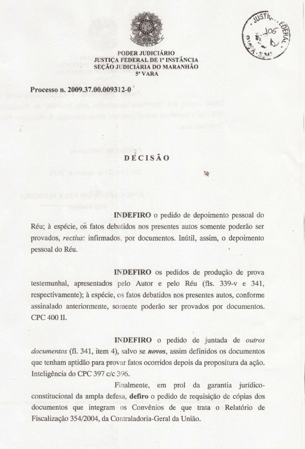 Abaixo o indeferimento do juiz Carlos do Vale Madeira sobre três pedidos de Hildo Rocha.