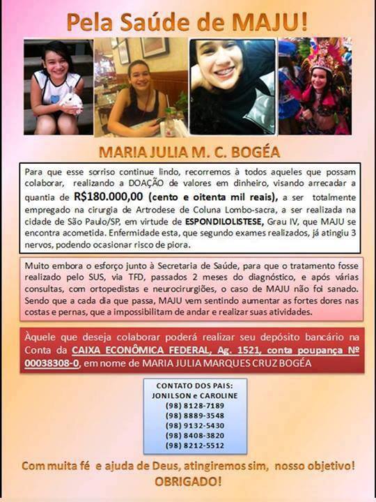 Um dos casos mais emocionantes que mexeu com a sociedade maranhense chama-se Maria Júlia M. C. Bogéa, jovem de 12 anos vive em repouso por conta de fortes dores. Ela que adorava brincar com amigos, se deparou com a triste noticia que possui espondilolistese, doença rara na coluna.