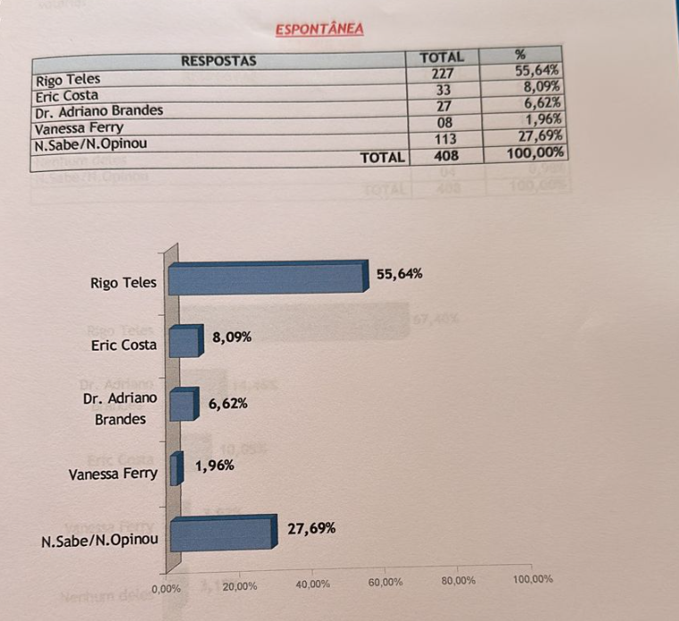 No cenário espontâneo, o Inop questionou em quem os eleitores votariam se as eleições fossem hoje e 55,64% afirmaram que escolheriam Rigo Teles, 8,09% apareceu com ex-prefeito Eric Costa, 6,62% disseram que votariam em Dr Adriano Brandes, 1,96% em Vanessa Ferry e 27,69% não souberam ou não quiseram responder em quem pretedem votar.