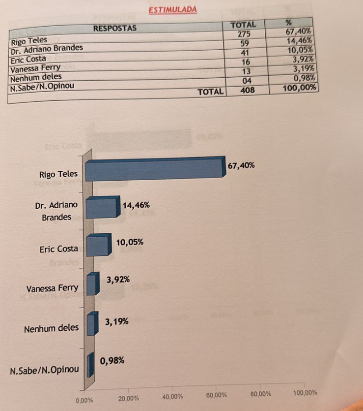 Já no cenário estimulado, o prefeito aparece com 67,4%, Dr Adriano Brandes, 14,4%, o ex-prefeito Eric Costa com 10,05%, Vanessa Ferry surge com 3,92% .