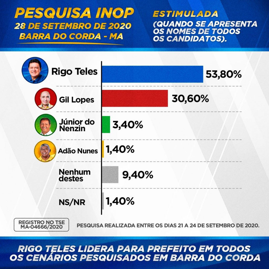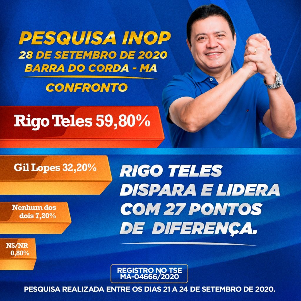 O Instituto Nacional de Opinião Pública(INOP) mostra liderança de Rigo Teles na corrida eleitoral de Barra do Corda.