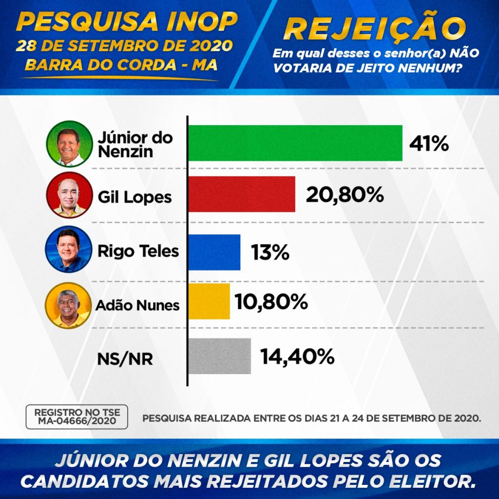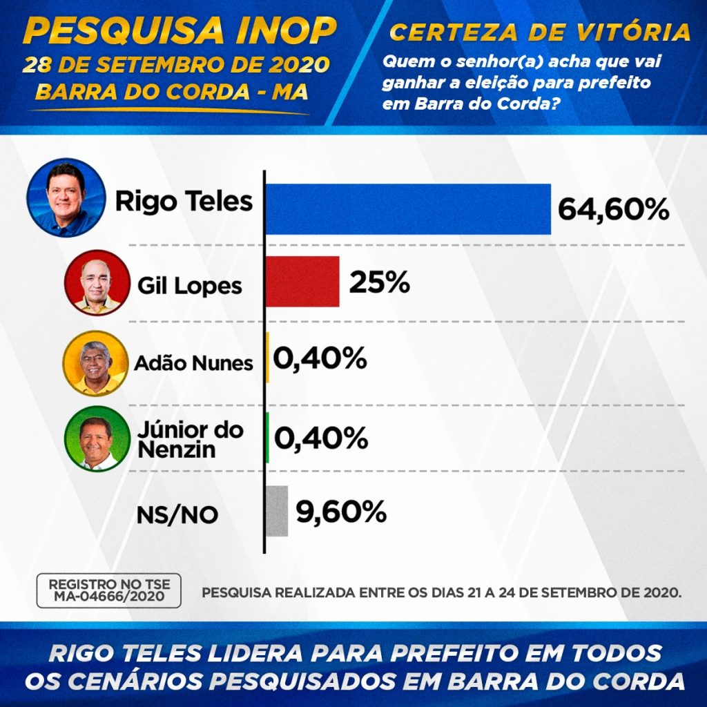 O levantamento perguntou aos eleitores se a eleição para prefeito de Barra do Corda fosse hoje, Rigo Teles seria eleito com 56,8% dos votos, contra 30,6% de Gil Lopes que está em segundo lugar. Em terceiro ficaria Júnior do Nenzin com 3,4% e Adão Nunes com 1,4%.