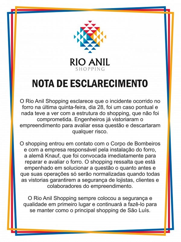 O Rio Anil Shopping que teve a liberação do Corpo de Bombeiros após ser apresentado o laudo, emitiu nota esclarecendo que foi um caso pontual e nada teve a ver com a estrutura do shopping.