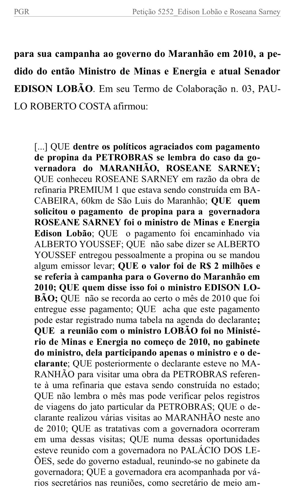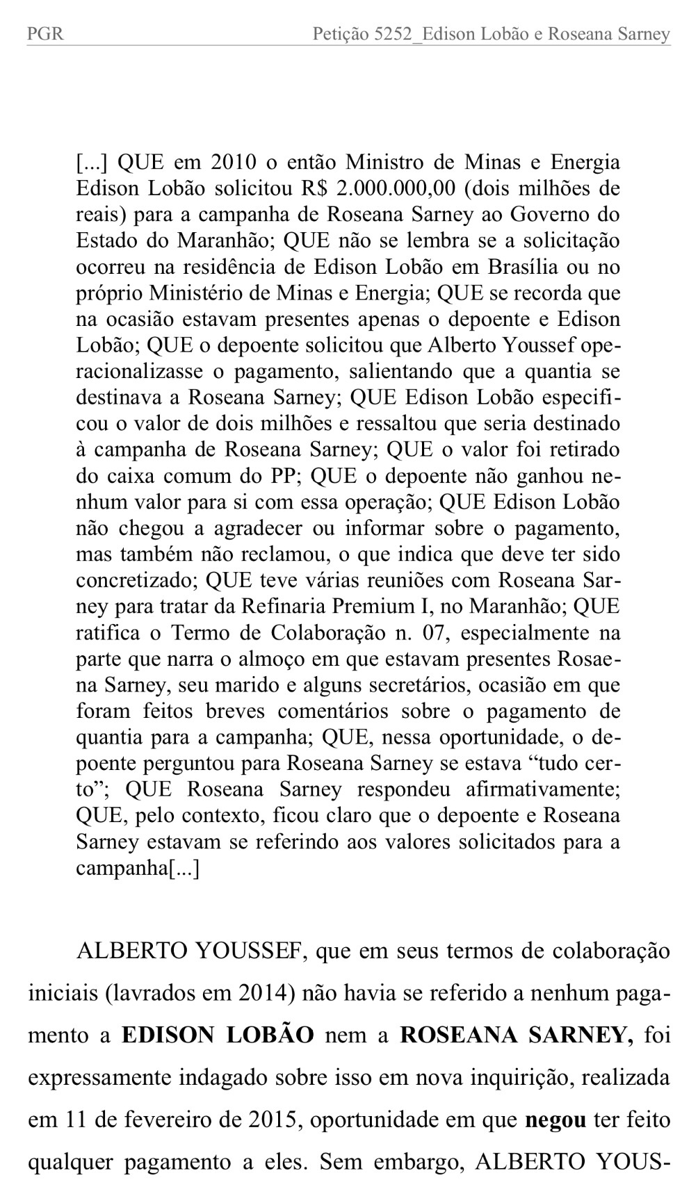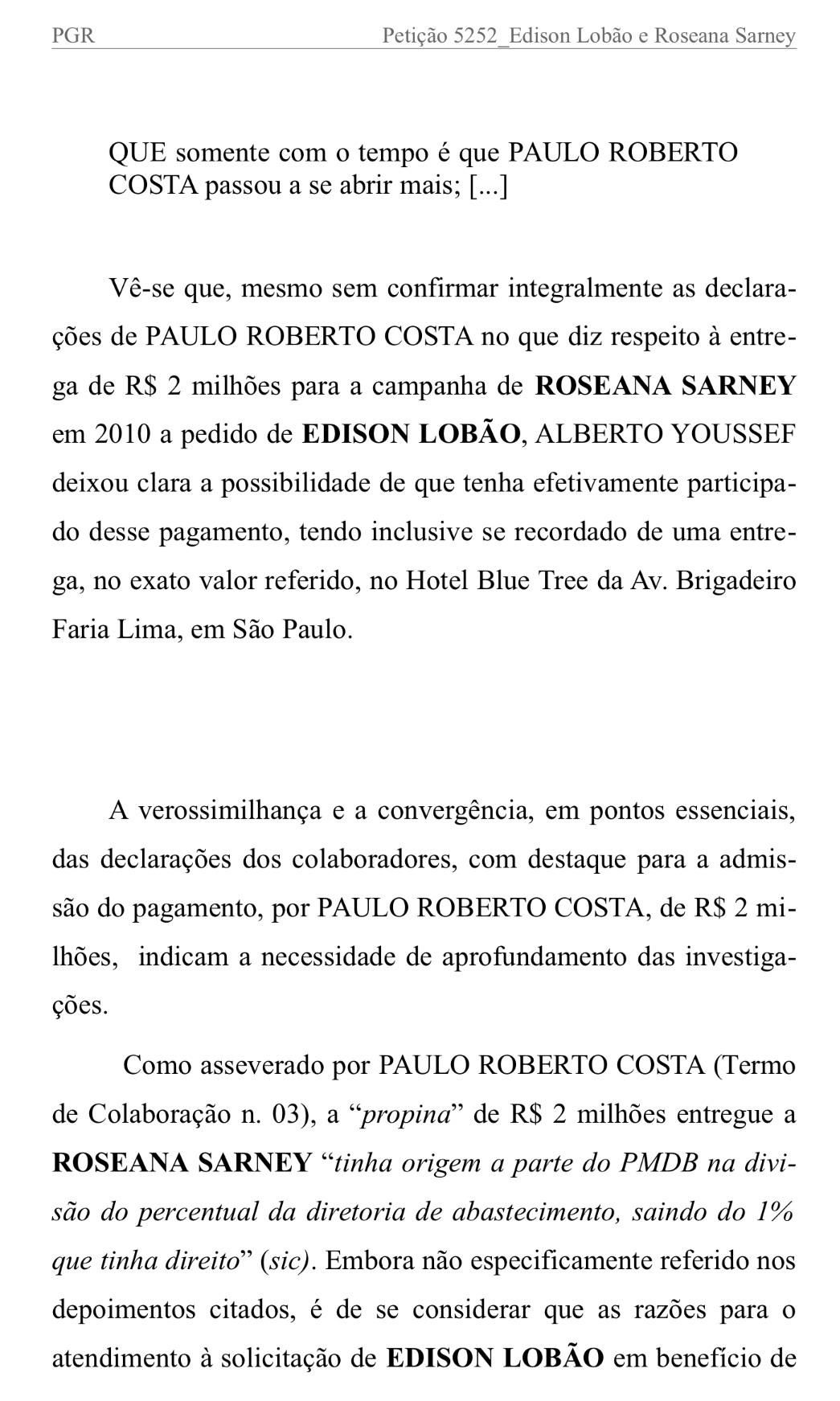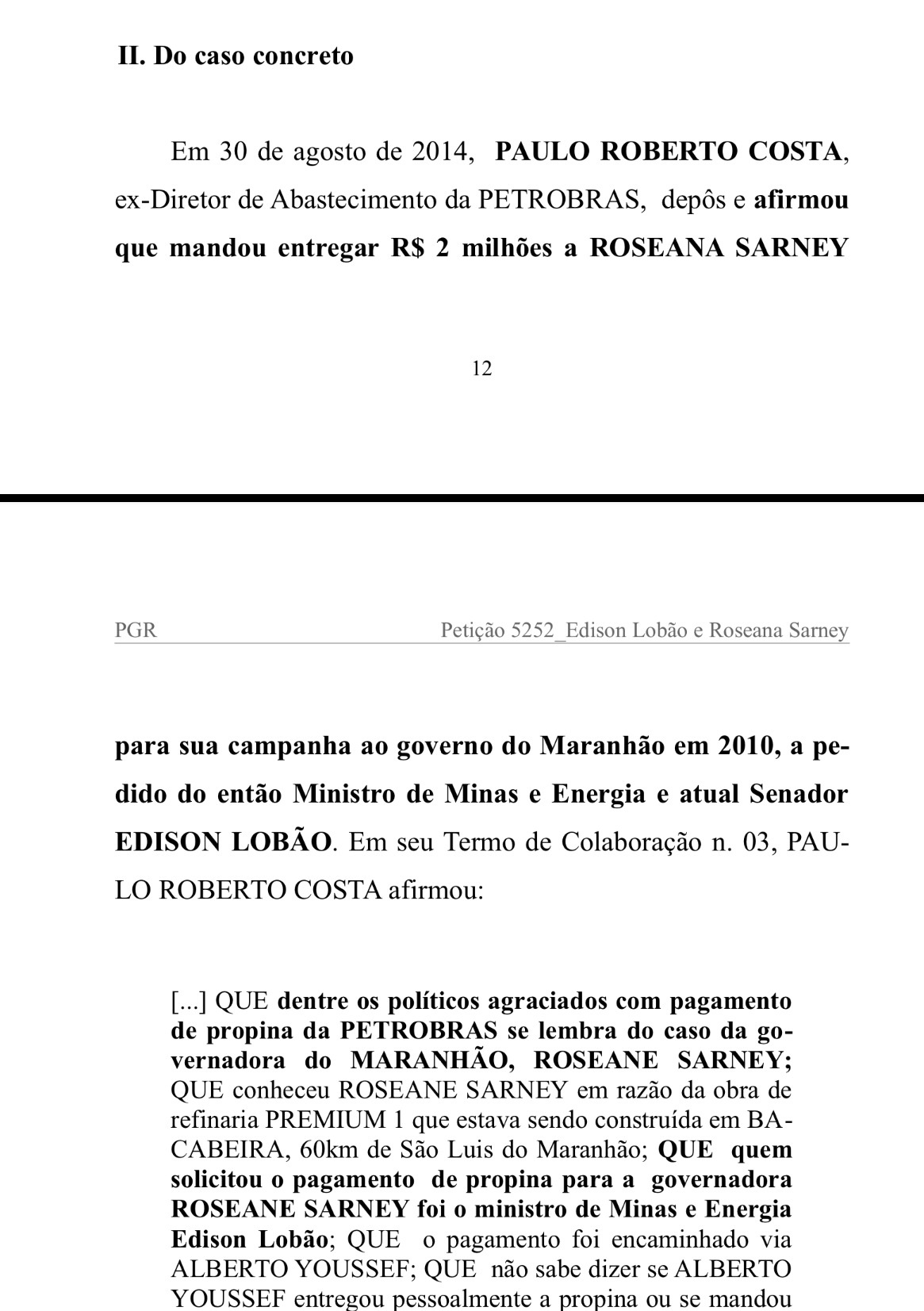 No pedido, o procurador utiliza como base as denúncias do ex-presidente da Petrobras, Paulo Roberto Costa, que diz ter repassado a mando de Lobão R$ 2 milhões a Roseana. Os peemedebista foram acusados de receberem benefícios do esquema de corrupção na estatal.