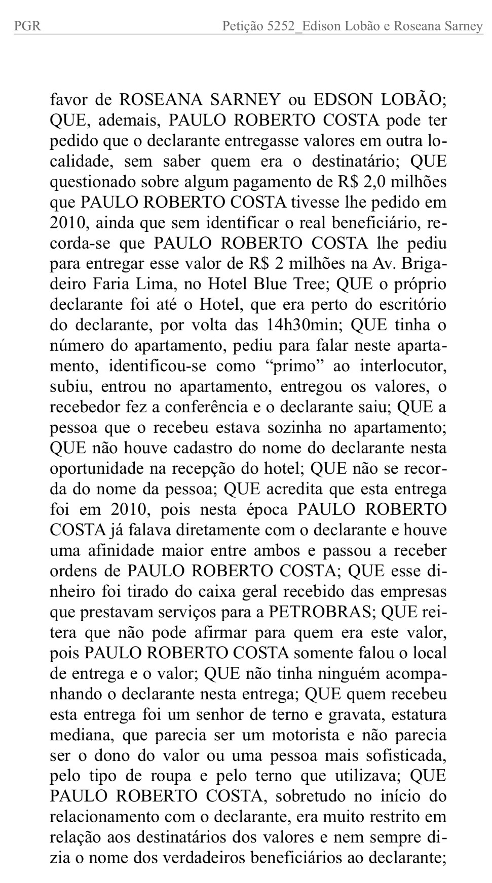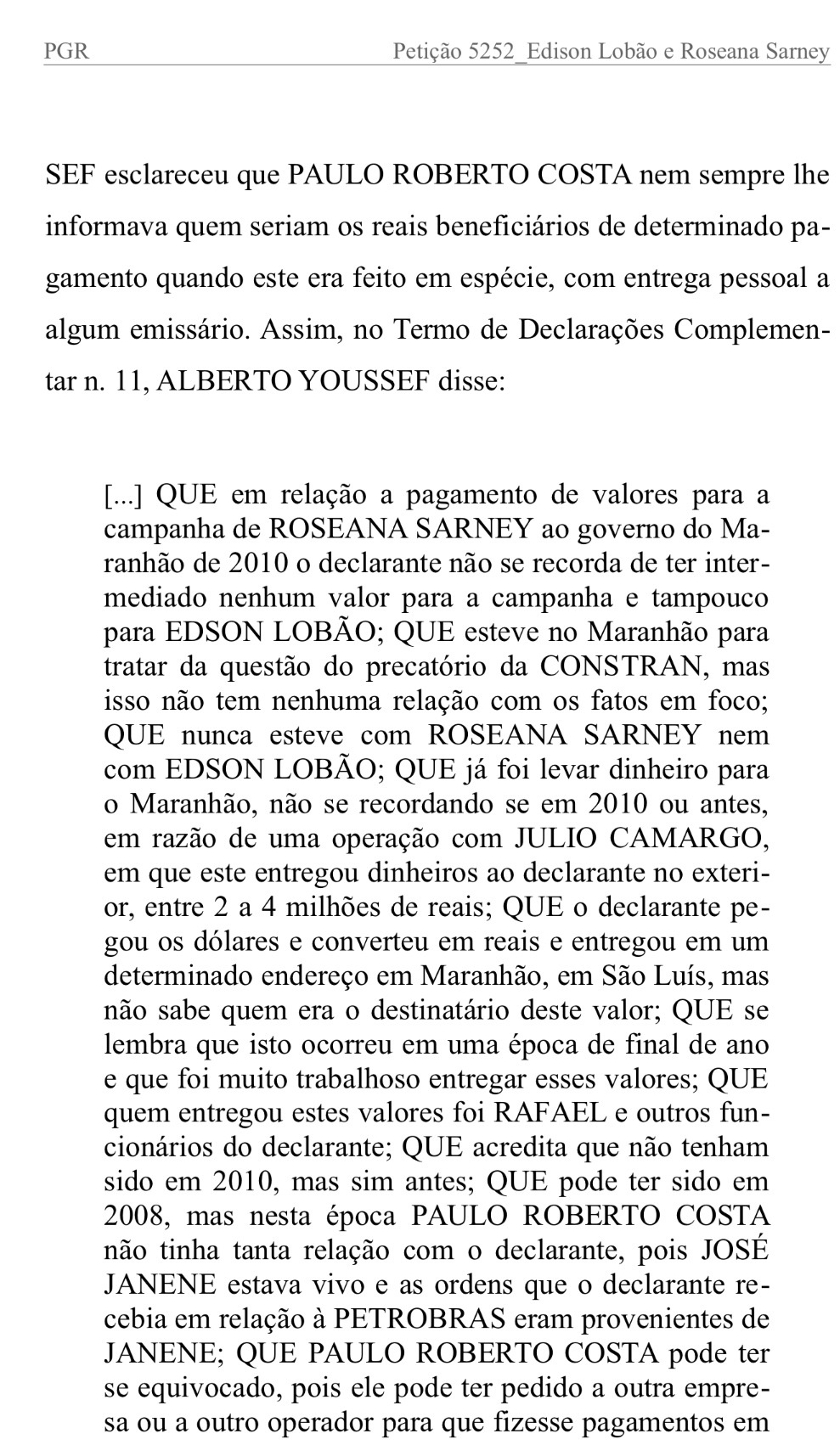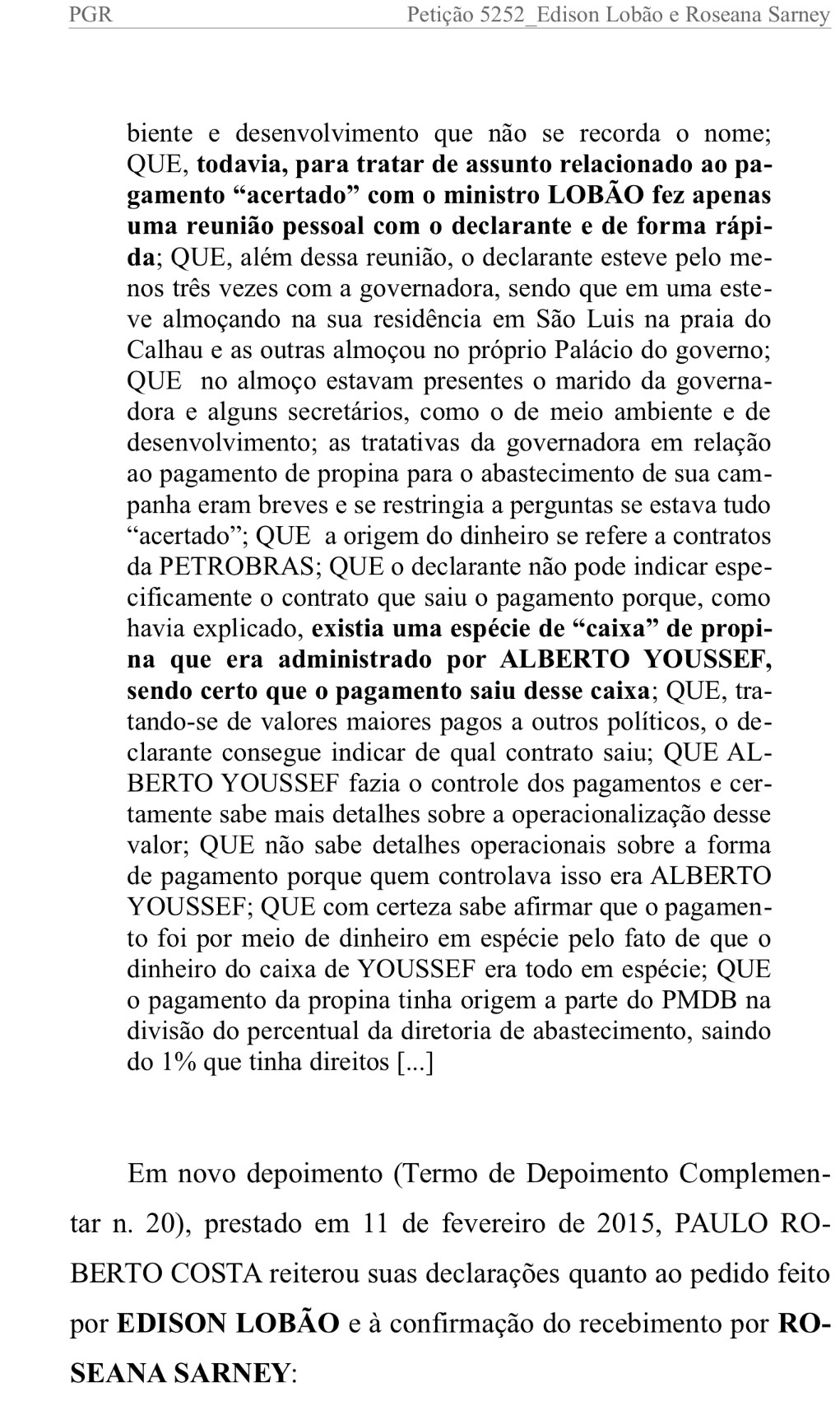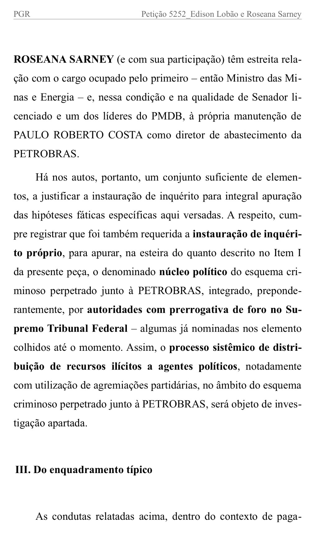 No pedido, o procurador utiliza como base as denúncias do ex-presidente da Petrobras, Paulo Roberto Costa, que diz ter repassado a mando de Lobão R$ 2 milhões a Roseana. Os peemedebista foram acusados de receberem benefícios do esquema de corrupção na estatal.