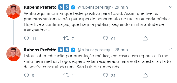 Estou sob medicação por orientação médica, em casa e em repouso. Já me sinto bem melhor. Logo, espero estar recuperado para voltar a estar ao lado de vocês, construindo uma São Luís de todos nós.”