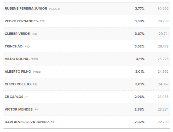Rubens Pereira 3,77%; Pedro Fernandes 3,68% e Cleber Verde 3,67% são os destaques 05/10/2014 | PÁGINA PRINCIPAL, Notícias Acompanhe os três candidatos mais votados, até o presente momento, para o cargo de deputado federal do Maranhão Navegação de Post 20% das urnas foram apuradas no MaranhãoCléber Verde volta a liderar a lista dos candidatos a deputado federal