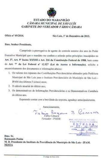 Foi pedido por ofício, informações ao presidente do órgão, Raimundo Penha, sobre as receitas e despesas na autarquia. No documento, o parlamentar solicitou a planilha dos valores dos repasses das Contribuições Previdenciárias efetuadas pela Prefeitura para o Instituto de Previdência nos últimos cinco anos; o cálculo atuarial do ultimo ano, além dos demonstrativos de informações previdenciárias e contábeis do último ano. Como não obteve sucesso, no dia 10 de fevereiro, entrou com mandado de segurança impetrado na justiça.