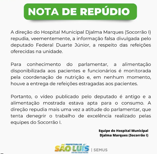 “A direção do Hospital Municipal Djalma Marques (Socorrão I) repudia, veementemente, a informação falsa divulgada pelo deputado Federal Duarte Júnior, a respeito das refeições oferecidas na unidade.