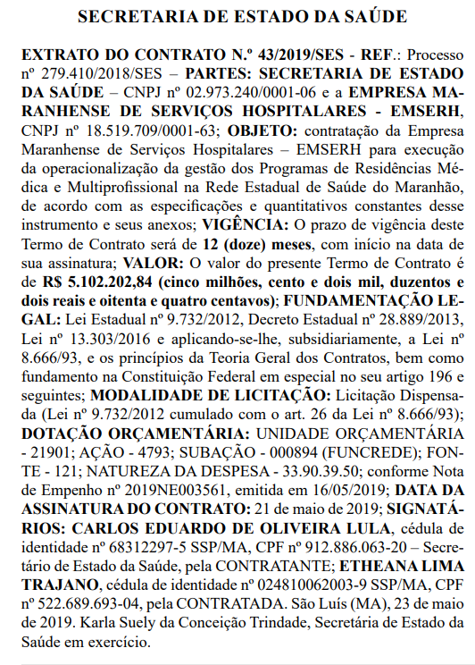 O contrato é de 12 meses e foi assinado no dia 21 de maio por Karla Suely da Conceição Trindade, secretária de Estado da Saúde em exercício.