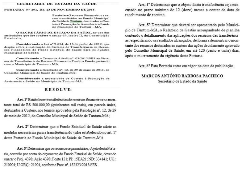 De acordo com Diário Oficial, Tuntum vai receber a quantia de R$ 500 mil em parcela única do Governo do Estado para aplicar no sistema de Saúde municipal.