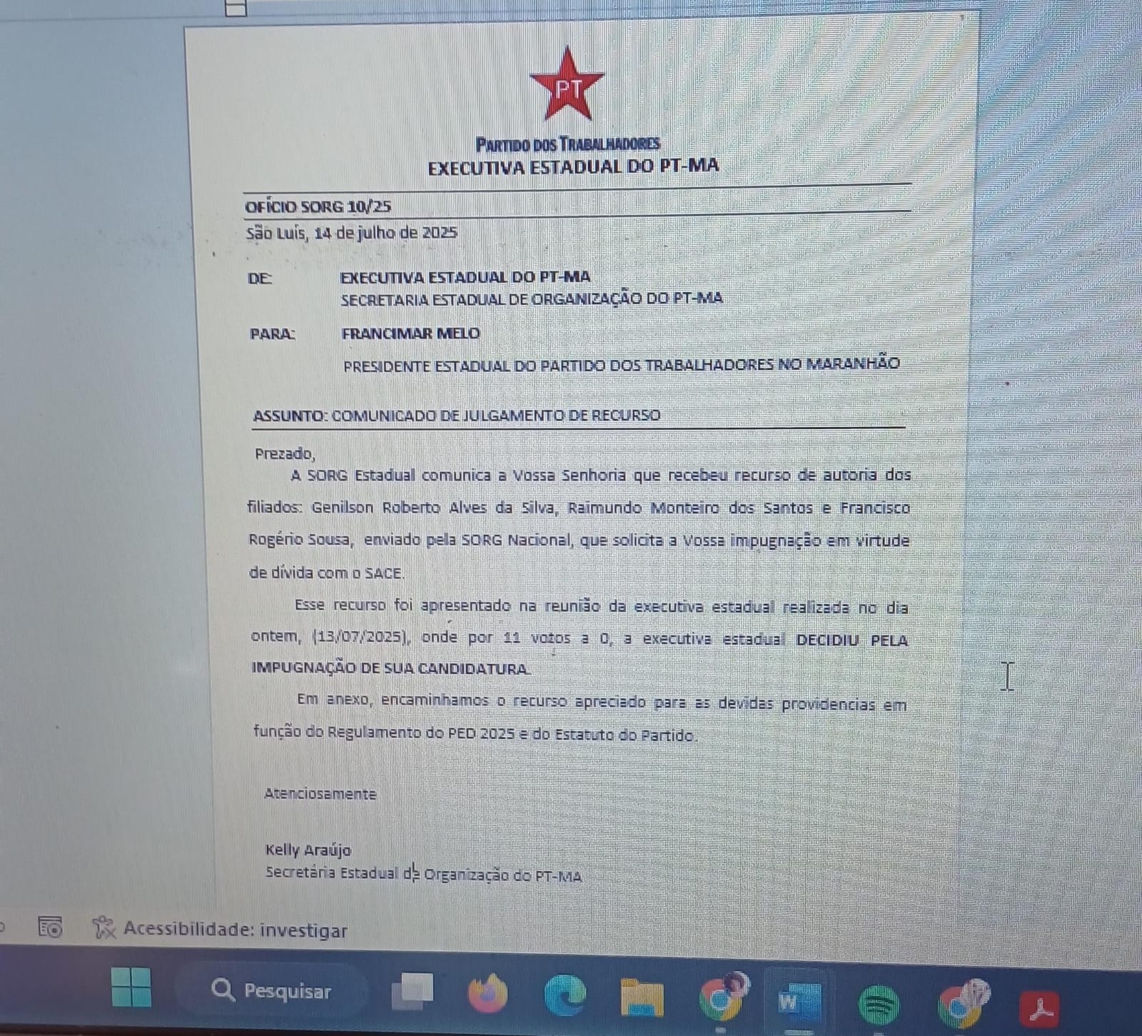 A Secretaria Estadual de Organização do Partido dos Trabalhadores no Maranhão (SORG-PT/MA) comunicou oficialmente, por meio do Ofício 10/25, datado de 14 de julho de 2025, que a Executiva Estadual do PT decidiu, por unanimidade (11 votos a 0), pela impugnação da candidatura de Francimar Melo à presidência estadual do partido.