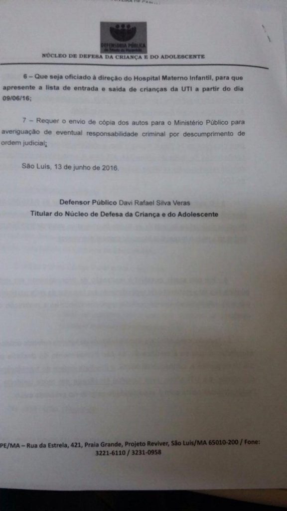 Por conta disso, os pais entraram com uma ação contra o município de São Luís através do Núcleo de Defesa da Criança e do Adolescente da Defensoria Pública do Estado. A ação que obriga a prefeitura a prestar assistência na realização da cirurgia é assinada pelo Titular do Núcleo, o defensor público Davi Rafael da Silva Veras.