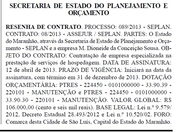 O secretário do governo Roseana Sarney, João Bernardo Bringel, através da Pasta do Planejamento e Orçamento (SEPLAN), firmou contrato com empresa para prestar serviço de hospedagem.