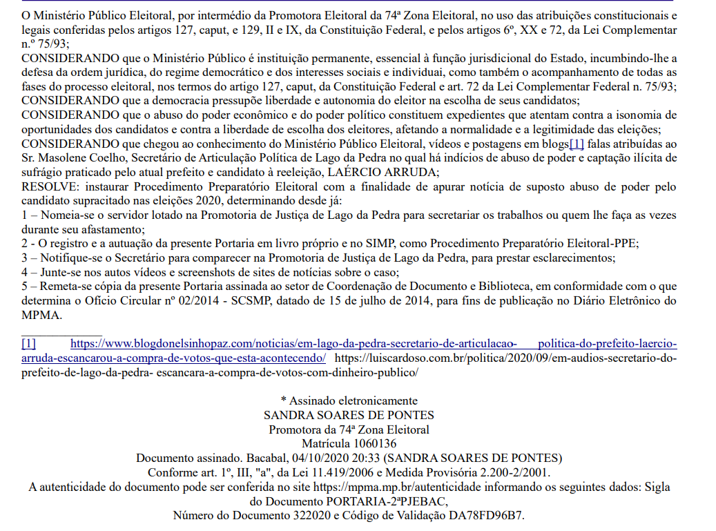 A Promotoria Eleitoral da 74ª Zona Eleitoral instaurou uma investigação contra o secretário de Articulação Política de Lago da Pedra, Masolene Coelho, por compra de votos e abuso de poder.