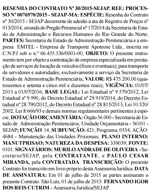 O contrato, com vigência de Julho de 2015 à Julho de 2016 foi assinado por Fernando Igor dos Reis Cutrim, da Assessoria Jurídica da Sejap, o secretário Murilo Andrade de Oliveira e o responsável pela EMTEL, Paulo César Miranda.