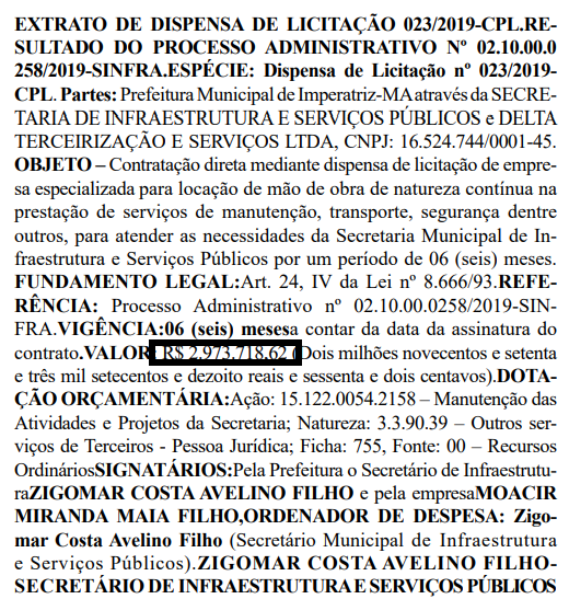 Sem licitação, a Prefeitura de Imperatriz, por meio da Secretaria de Infraestrutura e Serviços Públicos, firmou um contrato milionário com Delta Terceirização e Serviços, localizada em Glória da Goita, em Pernambuco.