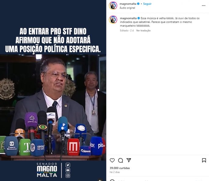 O senador do Espírito Santos, Magno Malta, ironizou o ministro da Justiça e indicado ao STF, Flávio Dino (PSB), após declaração de imparcialidade na Suprema Corte.