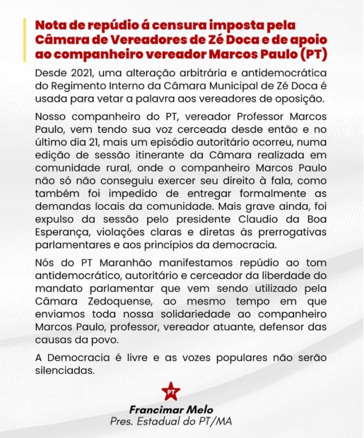 O Partido dos Trabalhadores (PT) no Maranhão emitiu uma nota de repúdio, condenando o comportamento antidemocrático e autoritário da Câmara de Vereadores de Zé Doca contra o vereador Marcos Paulo.