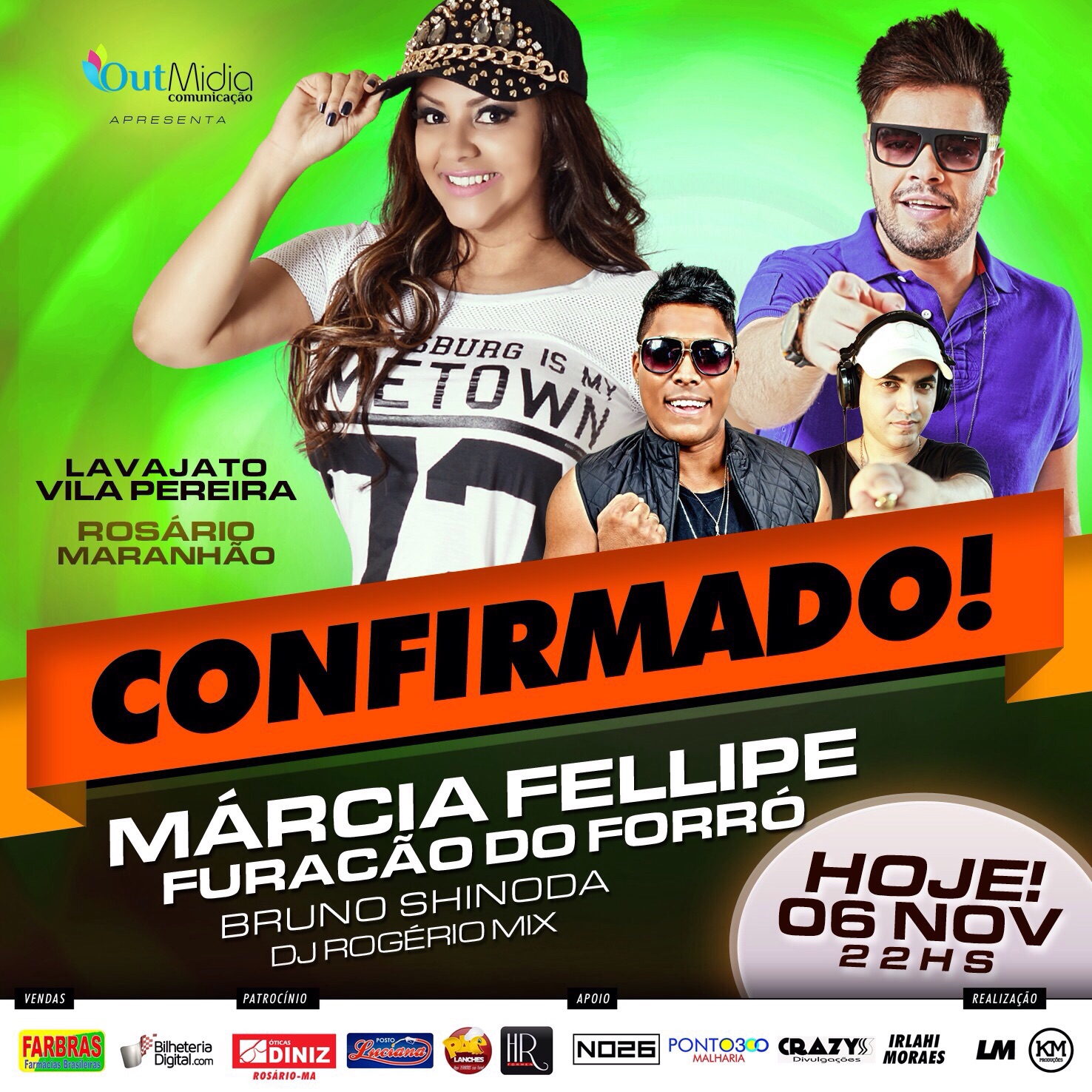 A cidade de Rosário receberá, nesta sexta-feira (06), por volta das 22h, o maravilhoso show de Márcia Felipe. O evento acontecerá no Lava jato Vila Pereira e contará também com a participação da banda Furacão do Forró, do cantor Bruno Shinoda e DJ Rogério Mix.