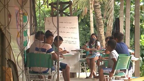 Na Comunidade Retiro dos Pretos, zona rural de Igarapé do Meio, a prefeitura construiu um espaço de barro e taipa para funcionar como escola. A professora conta que a rotina pedagógica é na base do improviso.