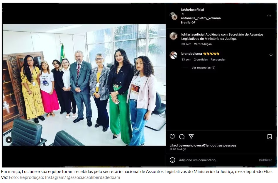 No dia 19 de março, Luciane esteve com Elias Vaz, secretário Nacional de Assuntos Legislativos de Flávio Dino. Pouco tempo depois, a 2 de maio, ela se encontrou com Rafael Velasco Brandani, titular da Secretaria Nacional de Políticas Penais (Senappen).