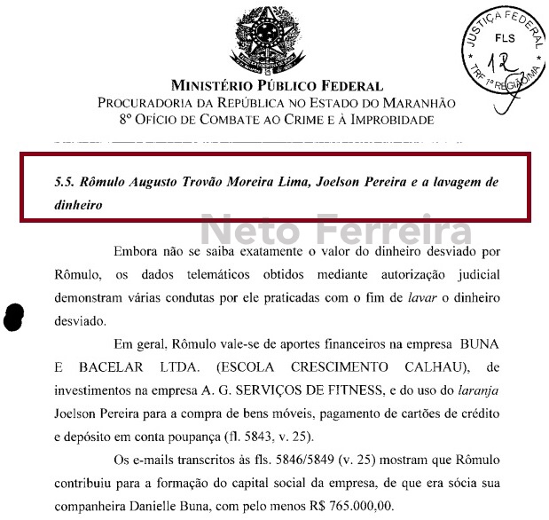 De acordo com documento obtido pelo Blog do Neto Ferreira, Rômulo Trovão teria praticado atos para lavar dinheiro com investimentos financeiros na empresa Buna e Bacelar Ltda., Escola Crescimento Calhau. Ele se utilizou de Joelson Pereira, apontado como laranja, para desviar dinheiro público repassado ao ICN, como também para, posteriormente, lavá-lo.