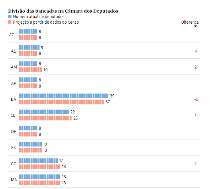 O número de cadeiras por estado, contudo, não é alterado desde dezembro de 1993, ano em que ocorreu o último redesenho das vagas na Câmara a partir da aprovação de uma lei complementar. Não houve atualização do tamanho das bancadas a partir dos dados dos Censos de 2000 e 2010.