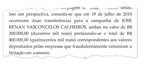 “Constata-se que em 19 de julho de 2010 ocorreram duas transferências para a campanha de José Renan Vasconcelos Calheiros, ambas no valor de R$ 200 mil perfazendo-se o total de R$ 400 mil correspondentes aos valores depositados pelas empresas que fraudulentamente venceriam a licitação em comento”, diz o documento do ministro Teori, obtido pela “Época”.