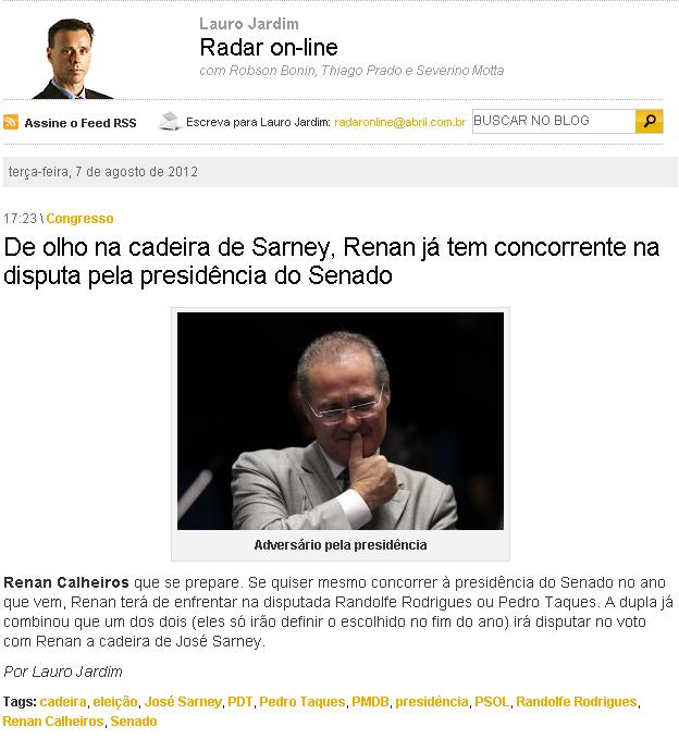 Tá vendo aí Lobão? Renan Calheiros de olho na cadeira de Sarney 07/08/201207/08/2012 | PÁGINA PRINCIPAL, Notícias Navegação de Post Ex-secretário do governo Jackson é denunciado por irregularidades na SaúdeEliziane Gama visita Conselho Tutelar da área Itaqui-Bacanga