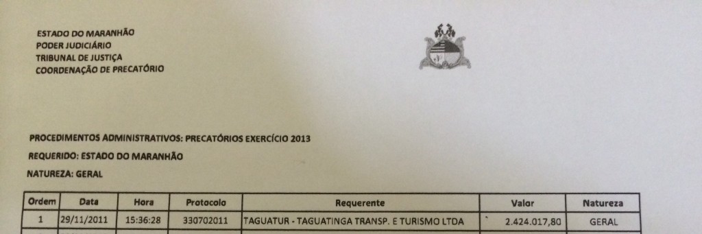 Uma das empresas que figura na lista é a Taguatur Transporte e Veículos LTDA., que busca providências do governo do Estado, em relação ao pagamento de precatórios, que se encontram vencidos há anos e totalizam um valor de R$ 2,4 milhões.
