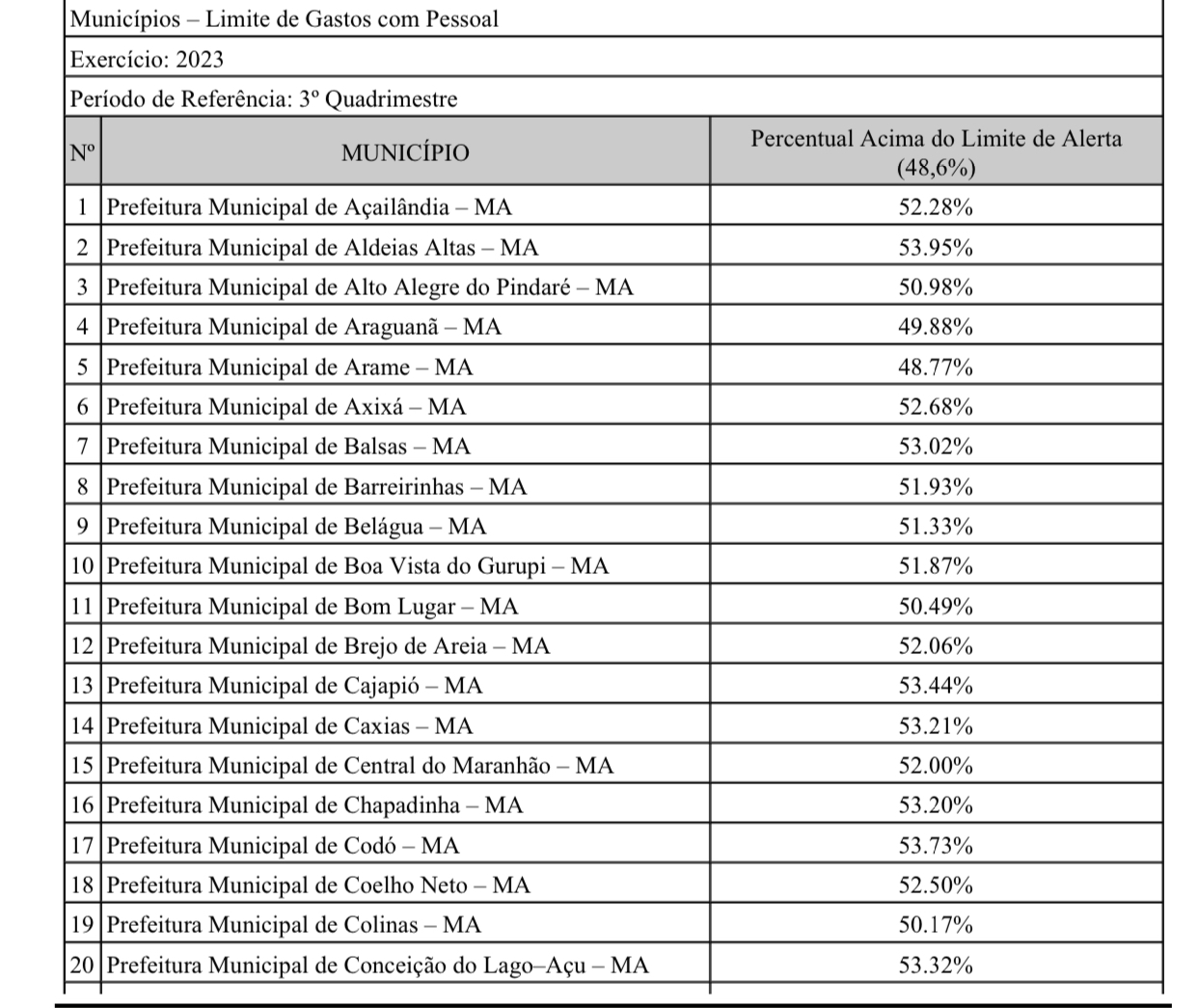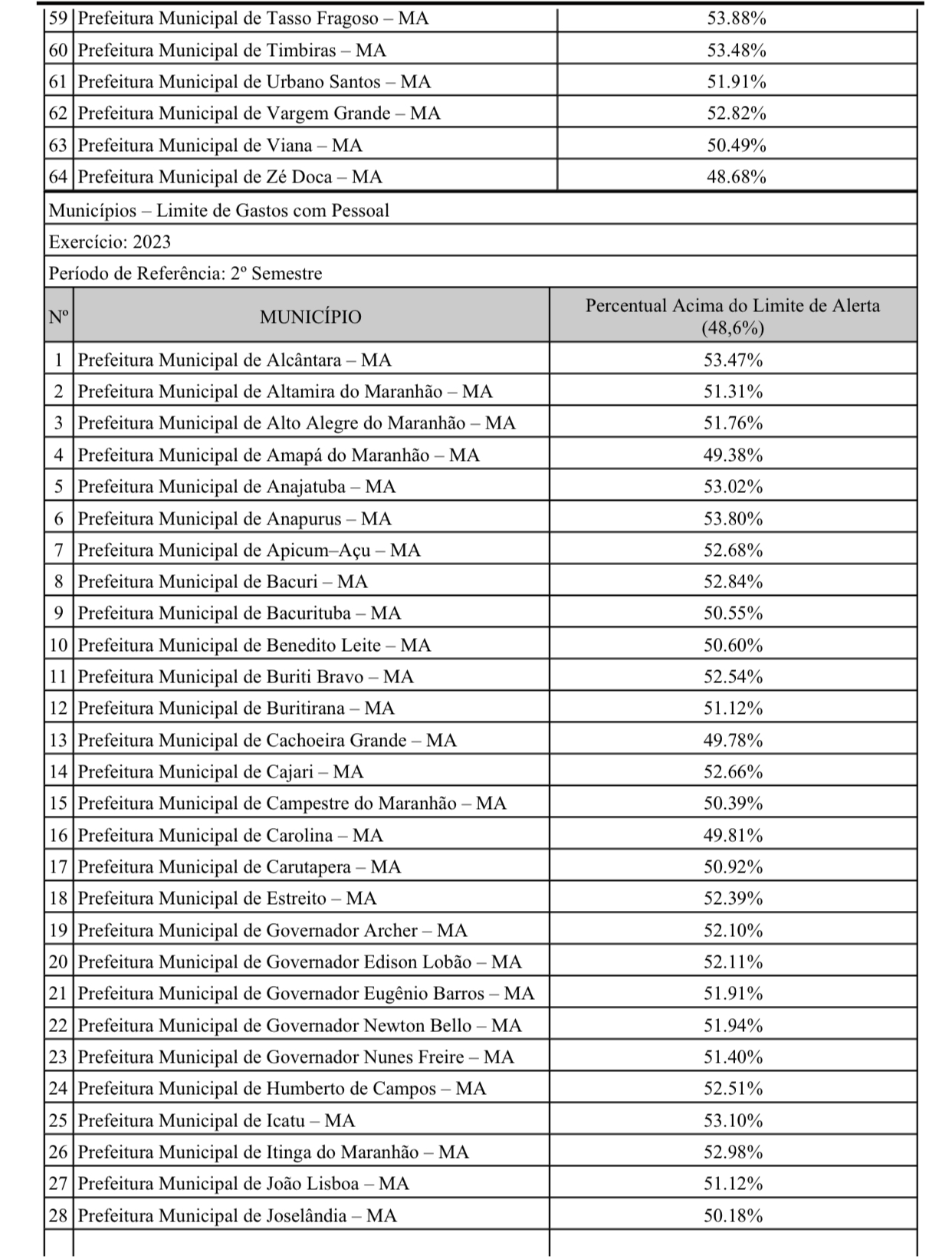 novo alerta direcionado à Prefeituras do Maranhão por excesso de gasto com pessoal no exercício 2023.